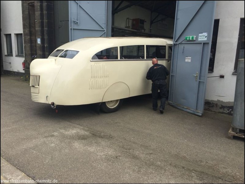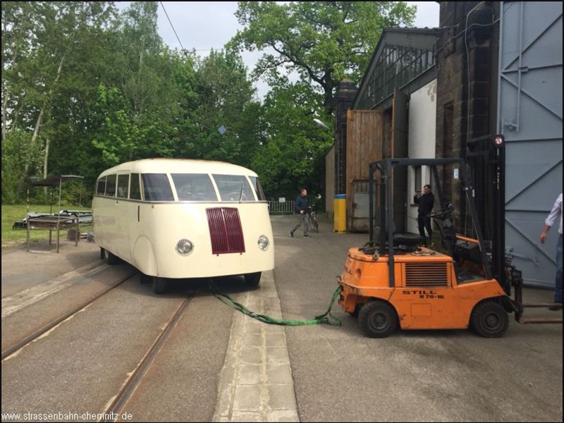 Da die dortigen Platzverhältnisse dies nicht zulassen, kam es zur Kooperation mit dem Straßenbahnmuseum Chemnitz. In dessen altehrwürdiger Museumshalle wurde ein geeigneter Rahmen zur Präsentation des Omnibusses gefunden. Somit kam das Fahrzeug vorübergehend bis auf wenige Kilometer entfernt seinem Entstehungsort nahe.
