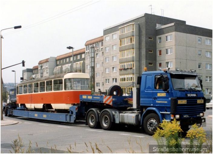 Transport des T3D 524 per Tieflader zur Modernisierung zur Waggonbau Bautzen GmbH Leipziger Straße / Salzstraße (05.08.1993)